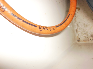 Gas delivery hosing. I recently found possibly the oldest length of hosing on a power boat since I started surveying. The date 1977. That makes the pipe over 34 years old!!!! I can't believe that the craft has not been surveyed in all those years and no one has noticed such a basic and potentially dangerous item that has not been replaced. Like wise copper pipe was not supported within the run and potential fracturing was highly likely, especially through a bulkhead where it wasn't correctly fitted. I cannot even start to remind folks how dangerous gas is on a vessel I have seen several terrible incidents from it. LPG is heavy, any leak in the system unless it is within the gas bottle locker with a good unrestricted drain will end up in the crafts bilge, any stray spark will be catastrophic. Need I say more!